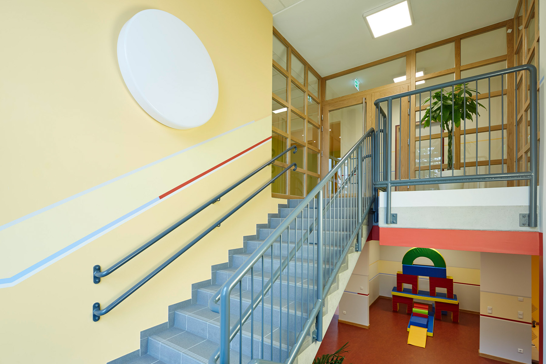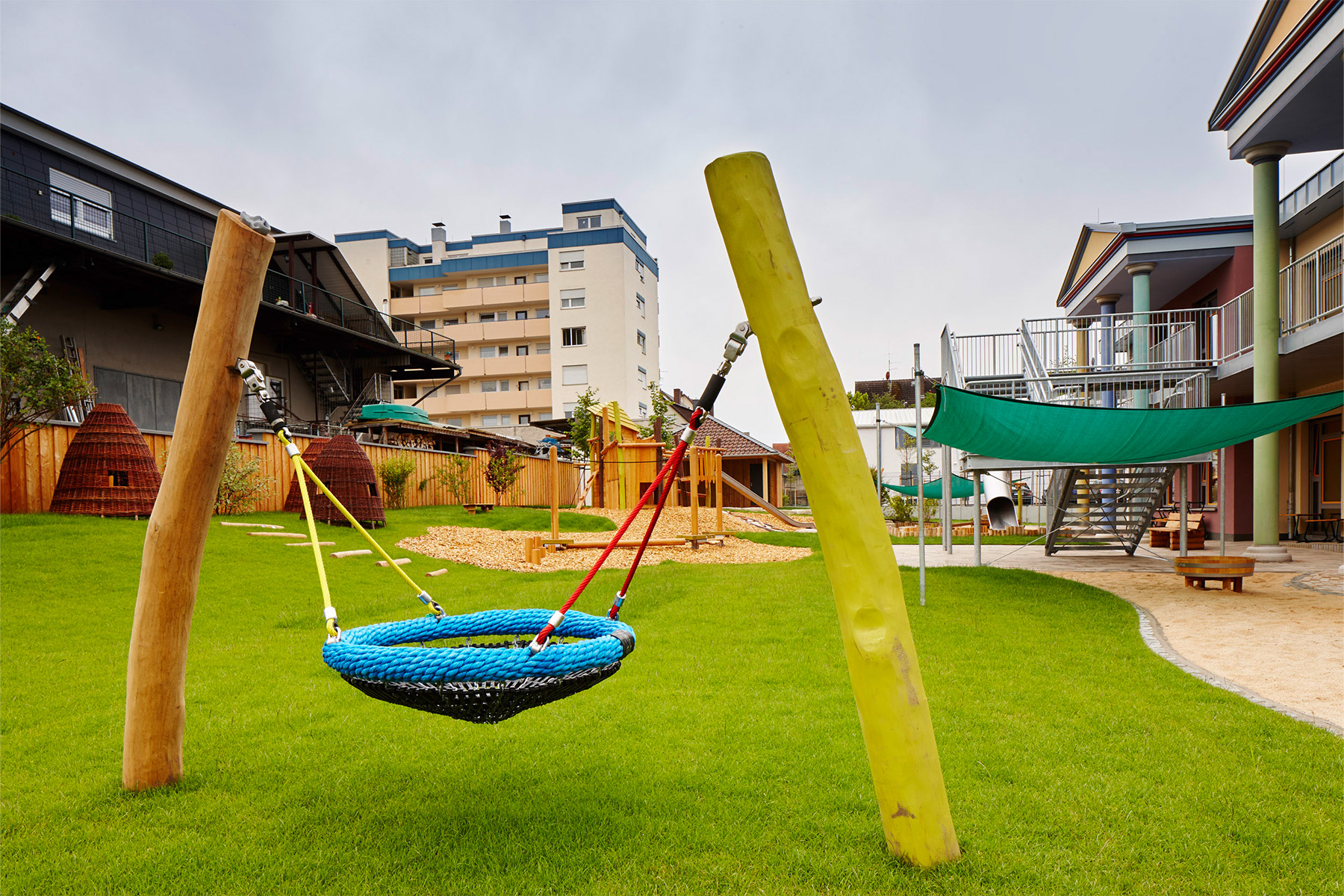 Die altersgemischte Betriebskita BioNest wurde in Dreieich im Stadtteil Dreieichenhain in unmittelbarer Nähe zur BioTest AG neu errichtet und bietet Betreuungsplätze für Kinder von Mitarbeiter:innen von BioTest an. Die Kita, mit der die Biotest AG setzt sich für die Vereinbarkeit von Familie und Beruf ihrer Beschäftigten einsetzt, ist ein wichtiger Baustein, um eine problemlose Rückkehr aus der Elternzeit zurück in den Beruf zu ermöglichen. Insgesamt bietet das BioNest Platz für 90 Kinder im Alter von ca. 1 Jahr bis zum Schuleintritt. Neben den Gruppenräumen zum gemeinsamen Spielen und Entdecken stehen den Kindern ein geräumiger Mehrzweckraum für vielfältige Bewegungserfahrungen, separate Schlafräume und ein sehr schön gestalteter Außenbereich zur Verfügung. Das Highlight im eingezäunten Außengelände ist, neben dem Sandspielbereich und der Kletteranlage, eine Rutsche, die aus dem ersten Obergeschoß direkt in den Spielbereich mündet.